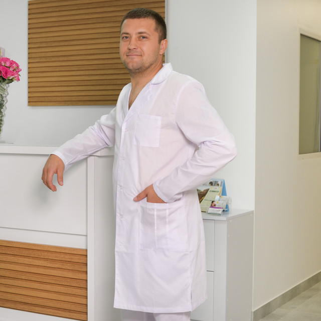 Чоловічий медичний халат Олександр з довгим рукавом, бічними функціональними кишенями і пришивним кишенею на грудях, комір трикутний класичний.